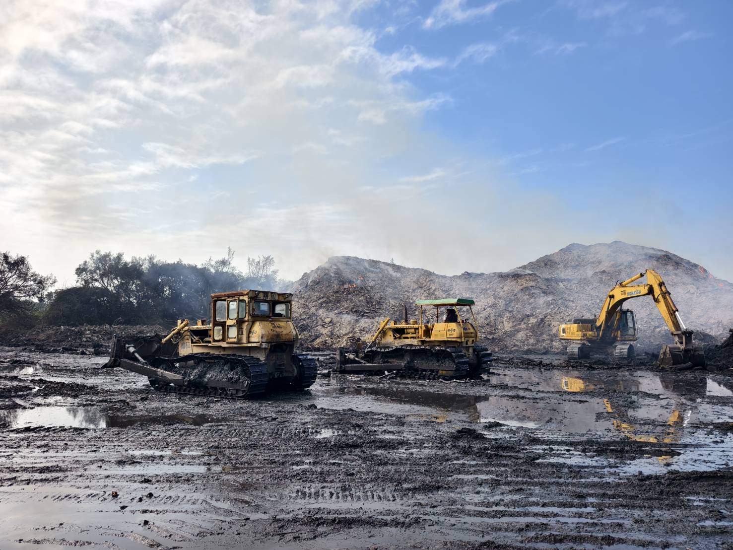 ▲烏樹林暫置場火災最新狀況 燃燒區域縮減。(環保局 提供)
