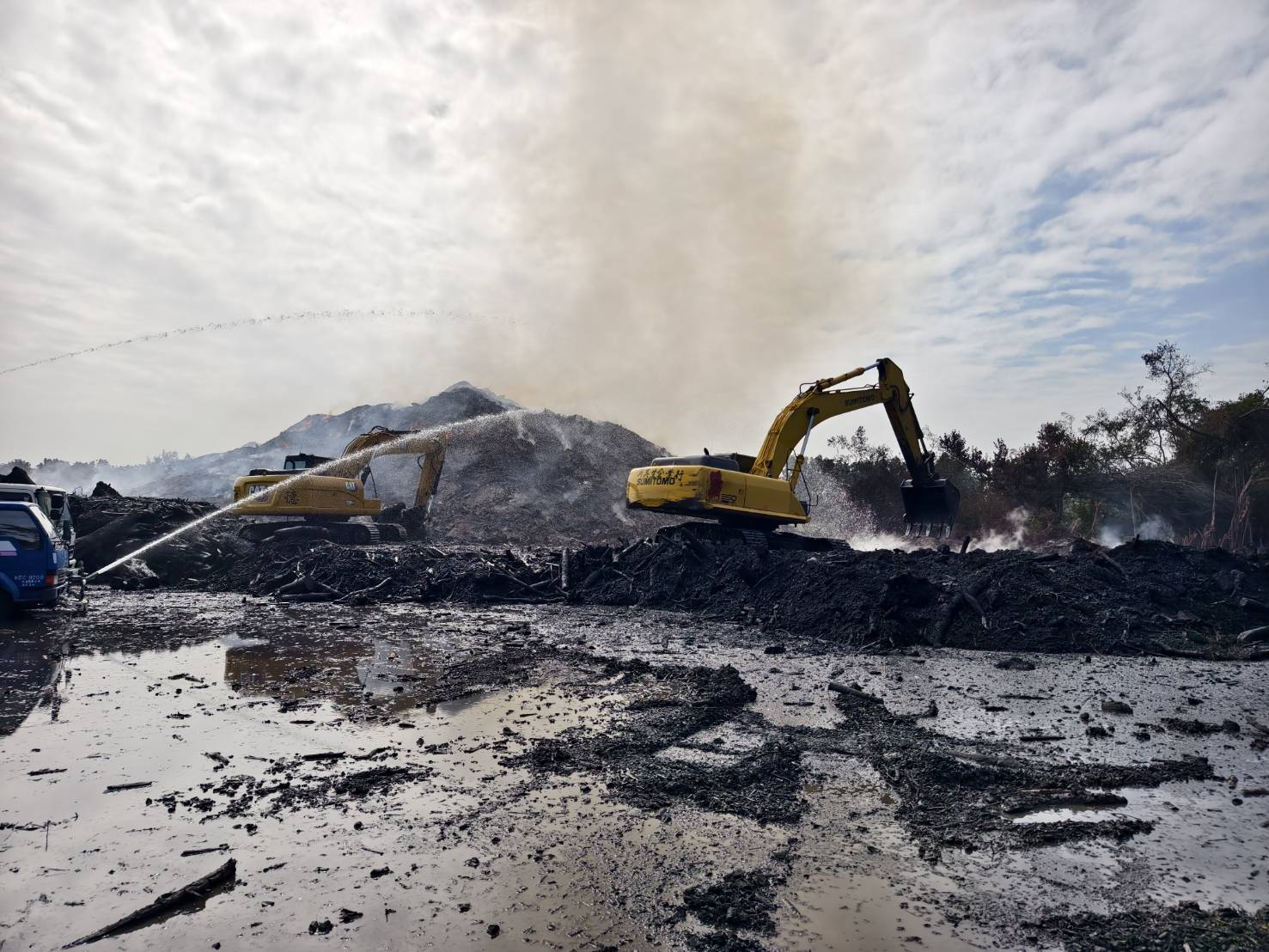 後壁區烏樹林風災廢棄物暫置場火警持續處理中,現場廢樹枝區經日夜不間斷地進行翻堆、灑水降溫及移置作業,11月28日已撲滅火勢,29日開始集中機具人力投入混合區撲滅工作。