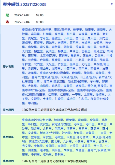 這次停水包括永康、安平、東區、北區、中西區、玉井、南化、新化、左鎮、善化、大內、山上、新市、龍崎、關廟、歸仁、仁德等地,部分區域為全面停水,部分則是水壓明顯降低。由於時間橫跨白天、夜間與上班日,市府已提前通知旅宿業者,提醒提前儲水,並主動告知旅客相關狀況。