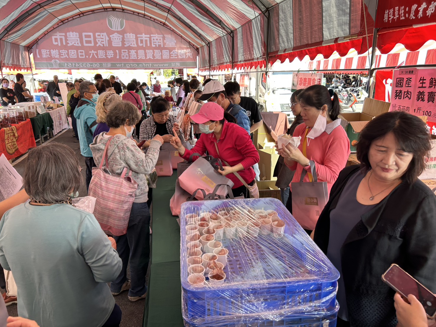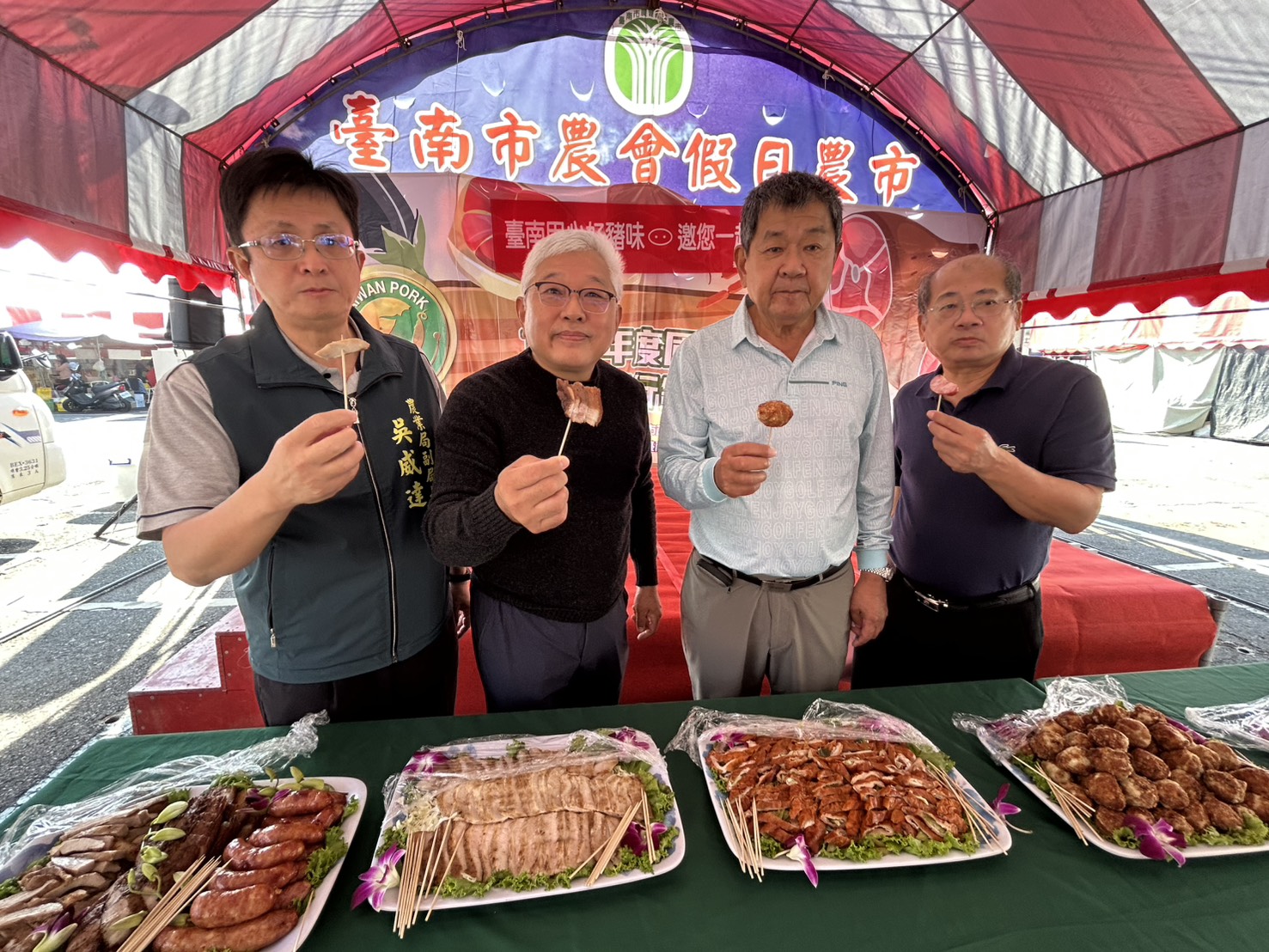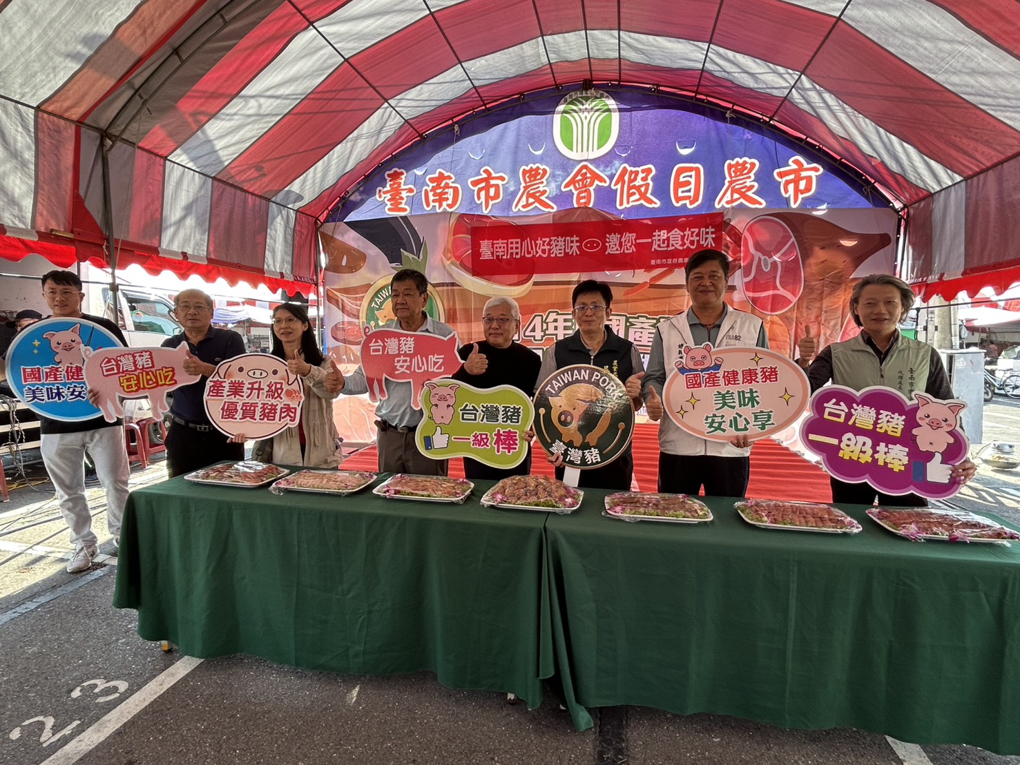 臺南市今(6)日在東區假日農市辦理「國產豬肉品嚐促銷行銷推廣活動」,透過臺南市農會及台南市養豬協進會籌辦,邀集多家在地優良商家到場設攤,並於現場提供品嚐美味豬肉料理以及促銷多元豬肉產品。上午9點多開始就吸引大批民眾到場選購,其中「台南市養豬協進會」發放香腸、鹹豬肉、貢丸湯,及「鮮蒸蝦仁肉圓」發放蝦仁肉圓時段更是大排長龍,人氣爆棚。