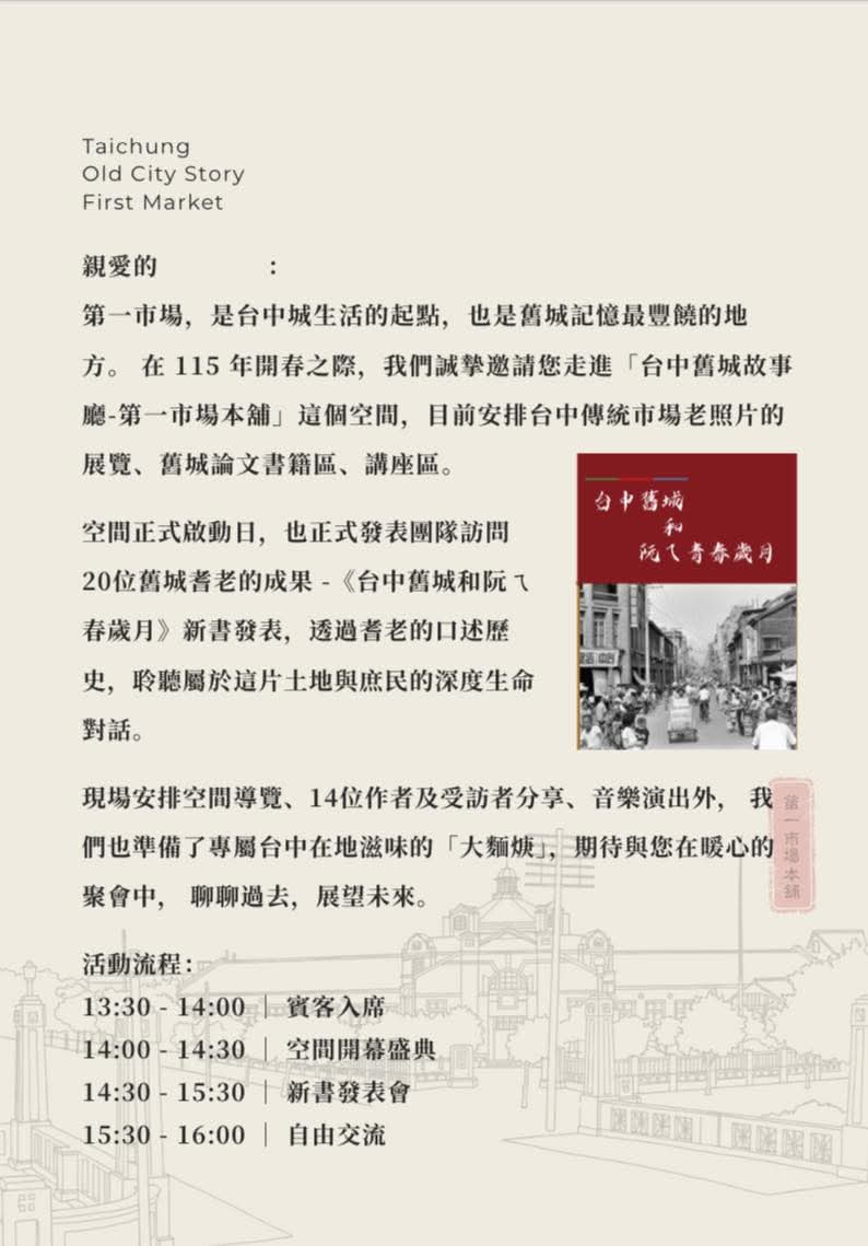 1月24日的開幕活動內容豐富,下午1時30分開放入席,隨後進行空間開幕盛典與新書發表。現場除了安排空間導覽、作者與受訪耆老分享、音樂演出外,主辦單位更貼心準備了台中最具代表性的下午茶——「大麵羹」。在暖心的聚會中,邀請市民朋友、文史愛好者以及所有對舊城有情感的民眾,一起回到這棟曾名為「第一市場」的大樓,聊聊過去,展望未來。