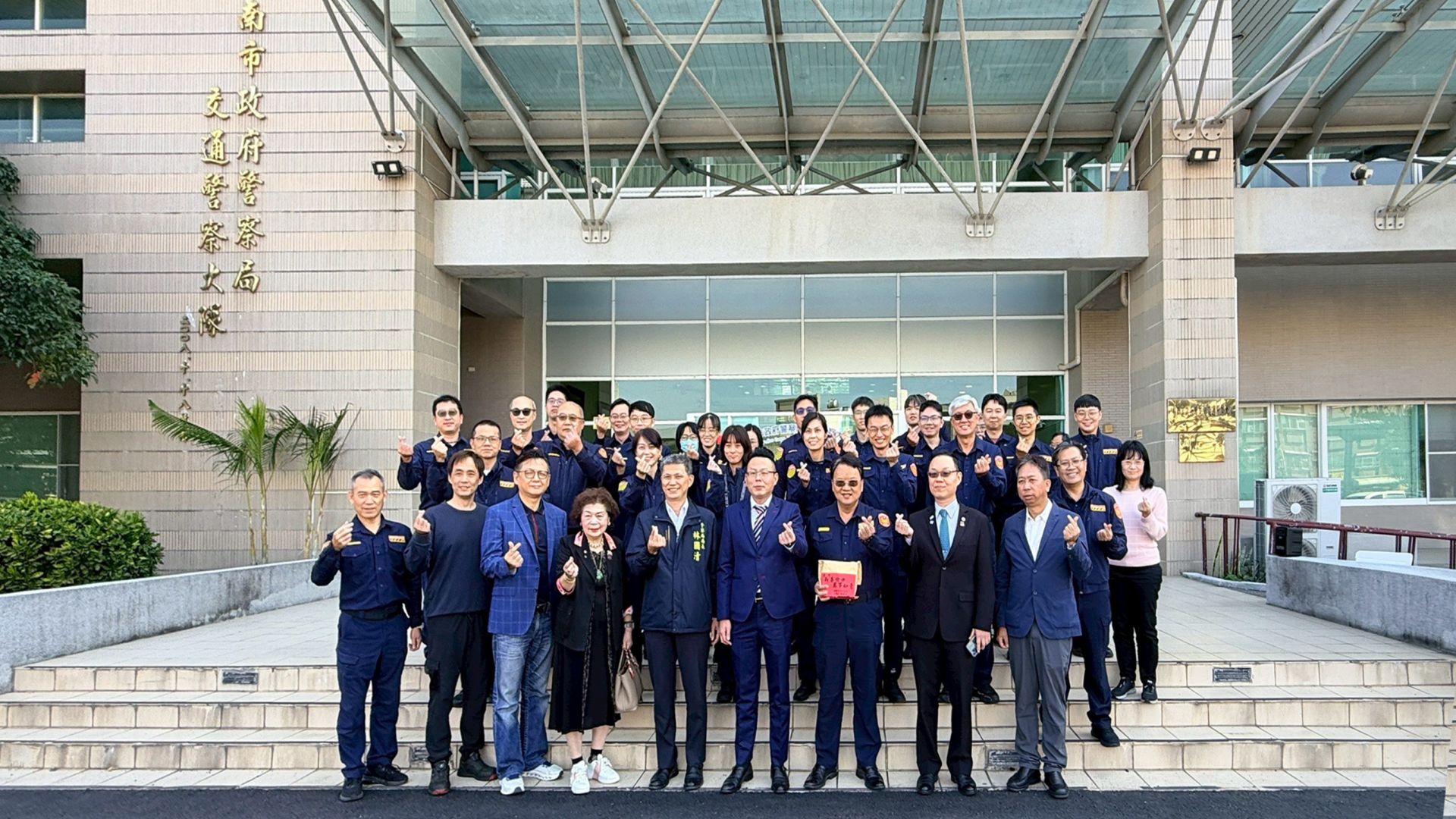 臺南市警察之友會理事長鄭丞焜(前排右4)在臺南市政府警察局局長林國清(前排右5)陪同下,前往交通大隊春節慰勞,感謝交通同仁守護道路安全、維持交通順暢。