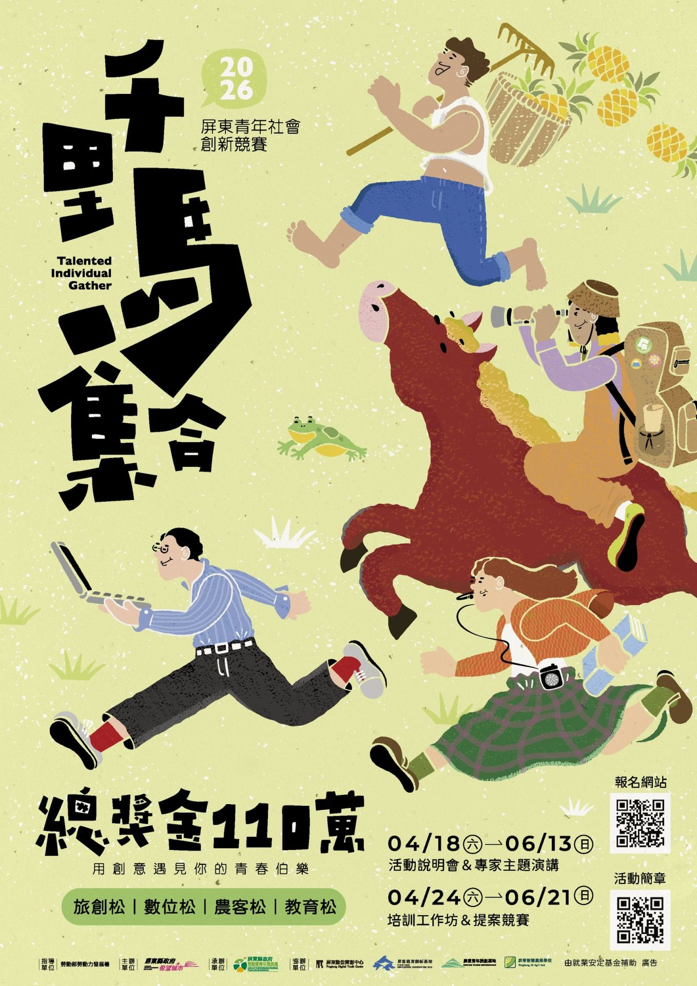 屏東縣政府持續推動青年返鄉與地方創生,年度指標性活動「千里馬集合!2026屏東青年社會創新競賽」正式啟動,廣邀全台青年帶著創意與行動力投入挑戰。透過提案實作與跨域合作,讓創意不再停留於想像,而是轉化為具體行動,在地方落地生根。