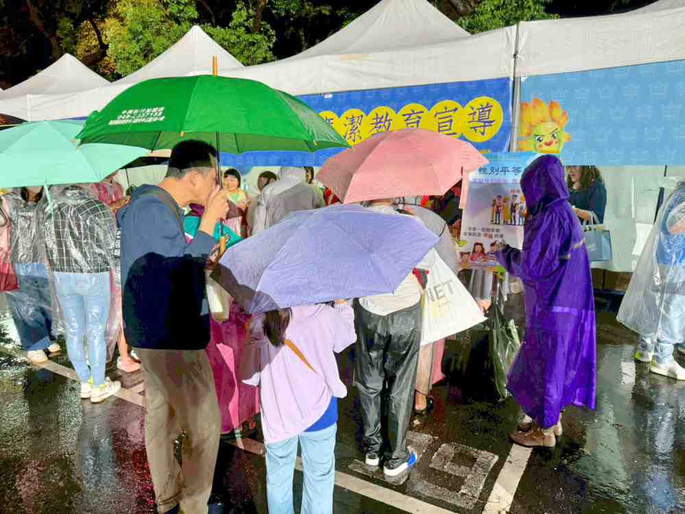 ▲新竹縣府政風處自4月24日至4月26日結合「2026客家親子劇《燈怪》新竹場」表演活動,跨機關單位攜手辦理社會參與反貪宣導活動,民眾不懼風雨排隊參與廉政及反賄選宣導活動。(圖/竹縣府政風處提供)
